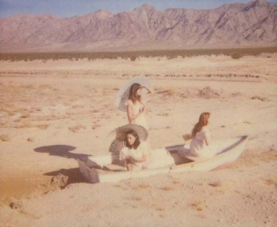 Dream Scene on Salt Lake (29 Palms, CA) (pictured above) contains a setting of three women on a boat within a vast desert. The scene seems like an indirect allegory to the three sirens who lured Odysseus and his crew in The Odyssey by Homer. Like as if the sirens are searching and waiting for their male prey in an ironic setting of a boat contained in a desert. Their dress remains formal, perhaps retro bridesmaid gowns with sun umbrellas which offer shelter from the heat and blinding glare of the sun. The women appear to be searching in three different directions as if in a dazed stupor and not realizing the land underneath them has suddenly dried up, turning into a wasteland. Like an installation with actors, the scene comes off as a direct work of art with irony rather than one of drama or comedy.